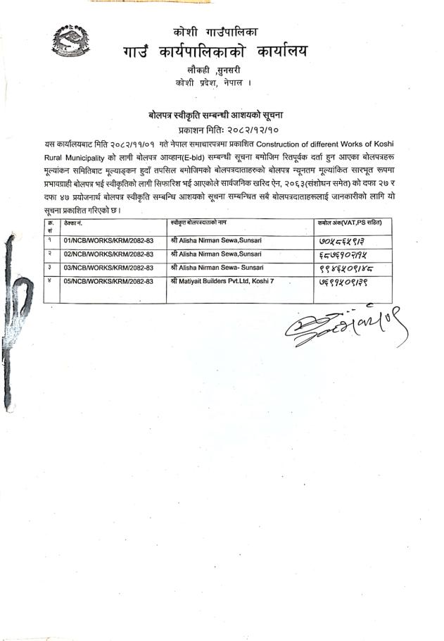 » बोलपत्र स्वीकृत सम्बन्धी आशयको सुचना ।।।।