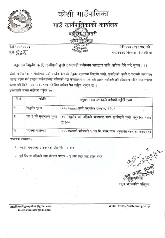 » अनुदानमा विद्युतीय चुल्हो, सुधारिएको चुल्हो र घरायसी बायोग्यास प्लान्टका लागि आवेदन दिने बारे सूचना ।।