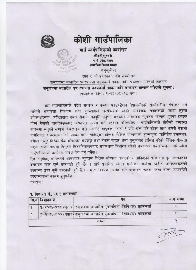 » समुदायमा आधारित पूर्णस्थापना सहजकर्ता पदका लागि प्रकाशन गरिएको बिज्ञापन |