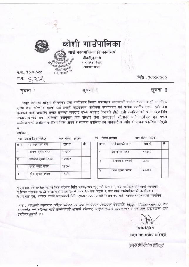 MIS अपरेटर र फिल्ड सहायक को सीप परिक्षण तथा अन्तरबार्ता सम्बन्धमा ।